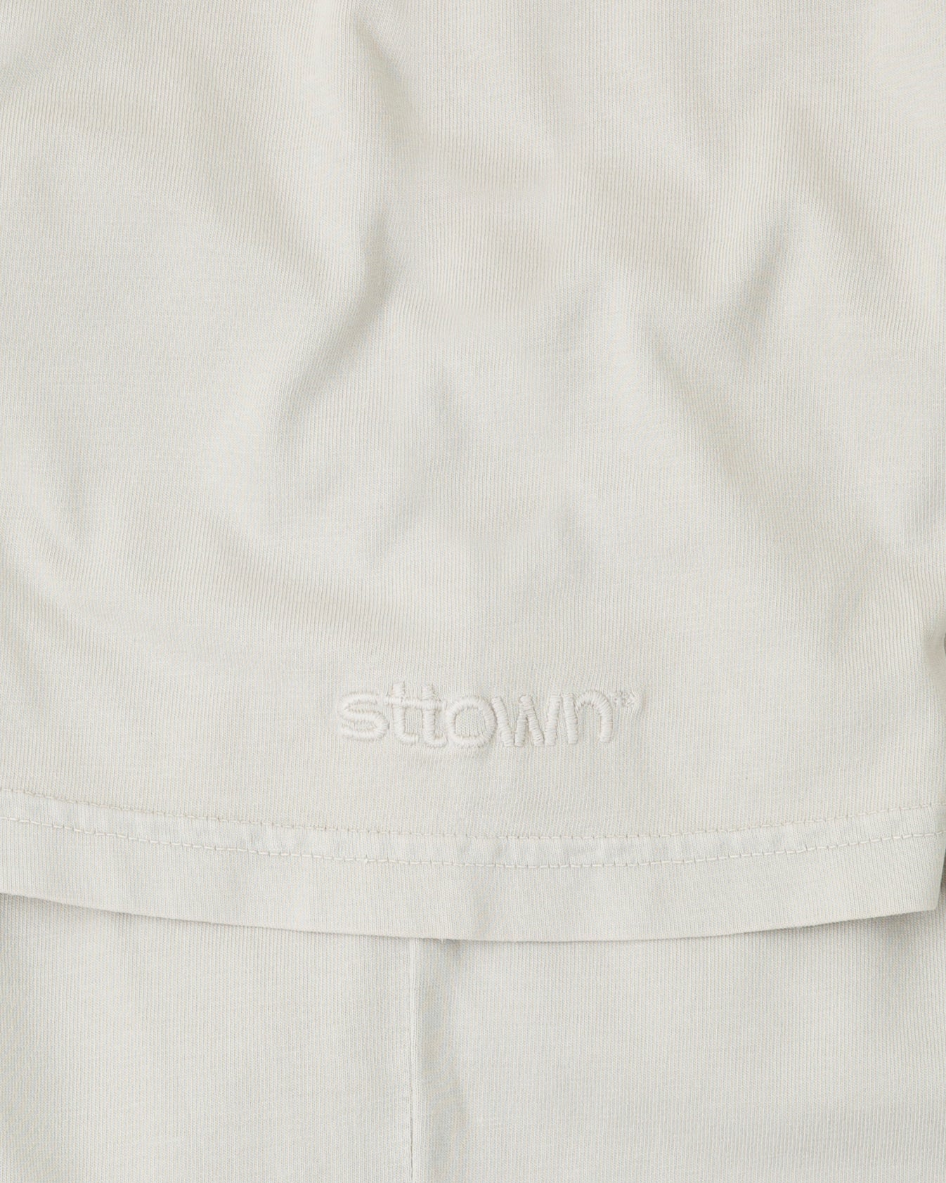 This grey color Fake Pocket tee fits relaxed and boxy fit in acid washed cotton and fake pocket. Rib crewneck and sttown embroidery logo on the right sleeves and Washed green color.