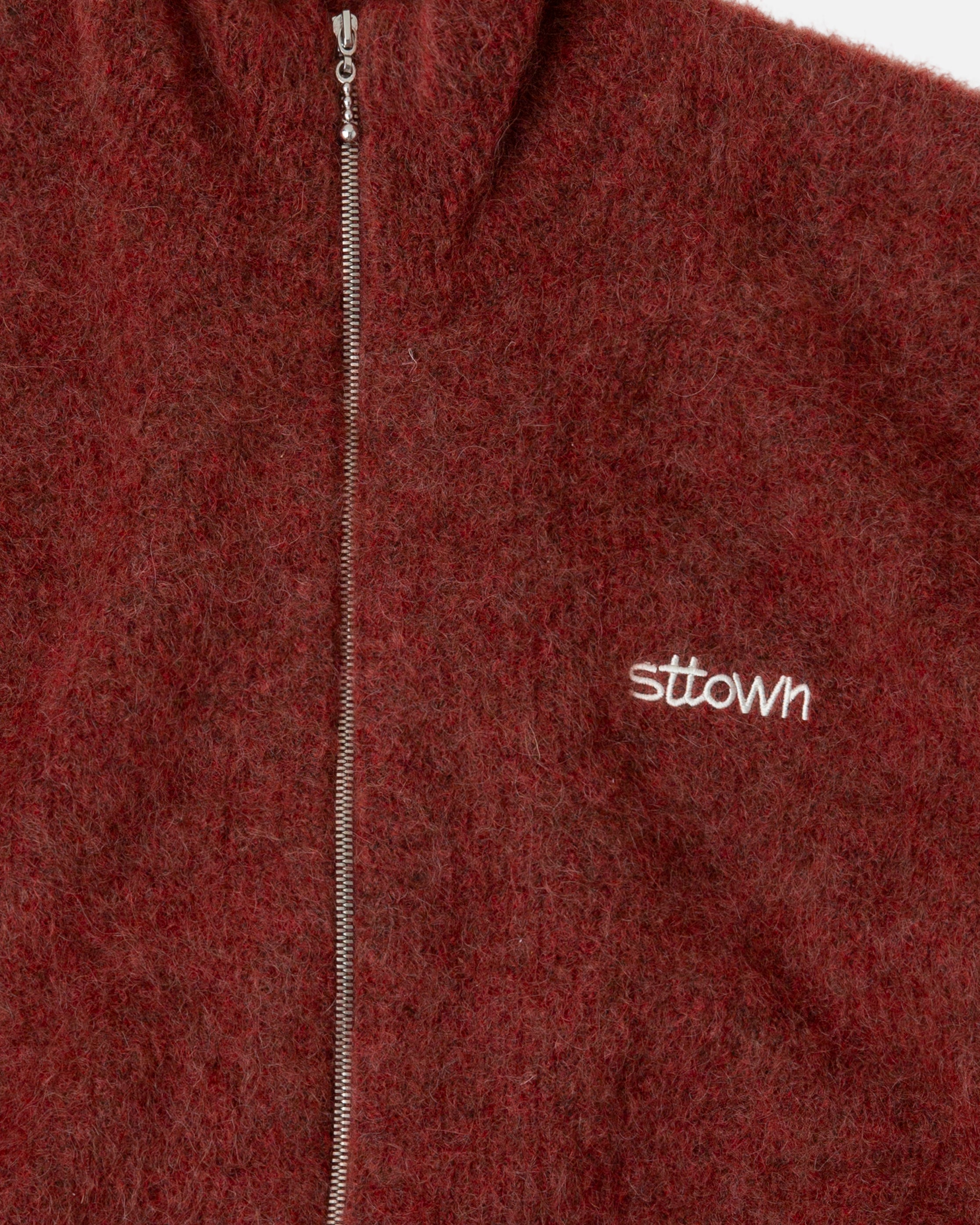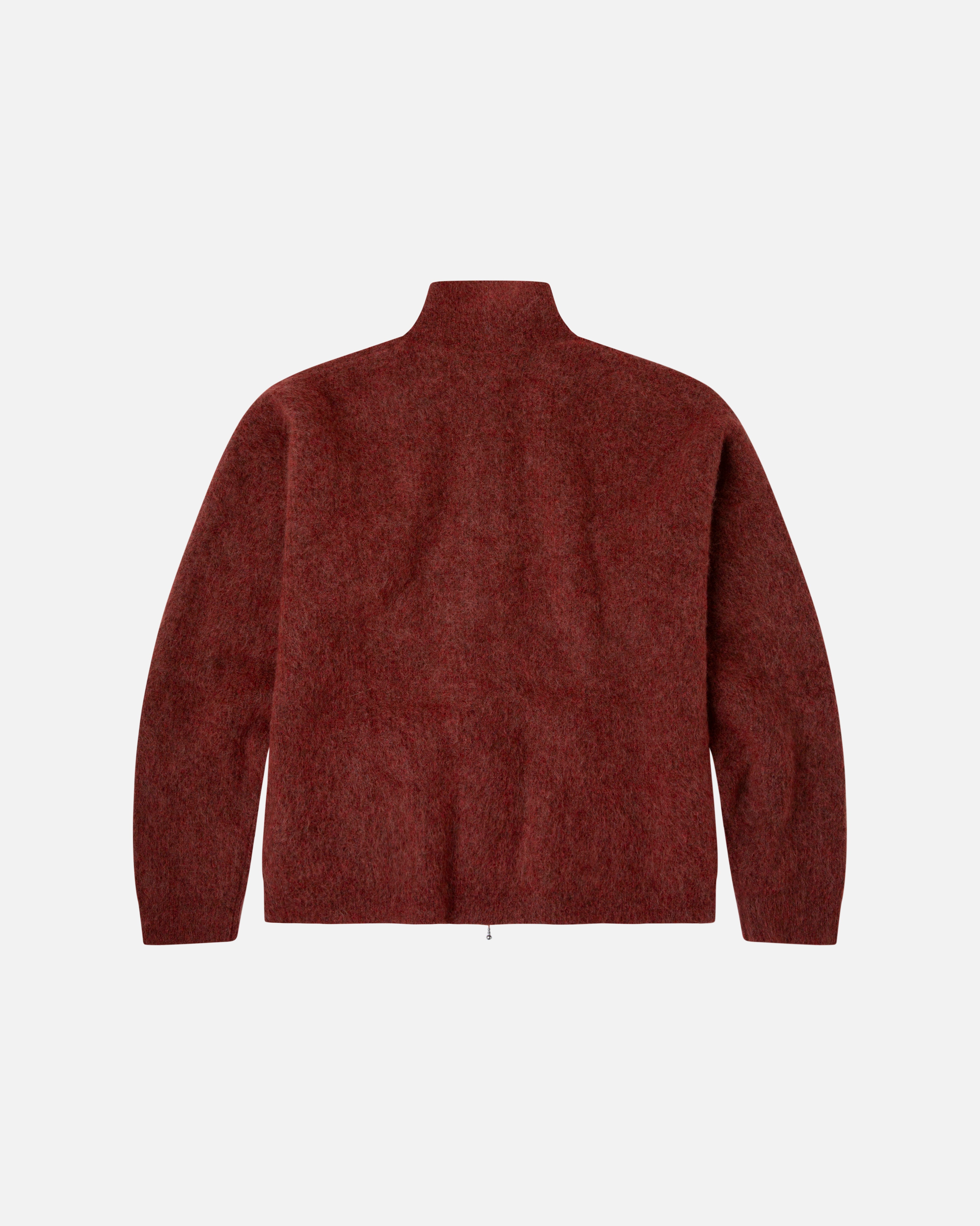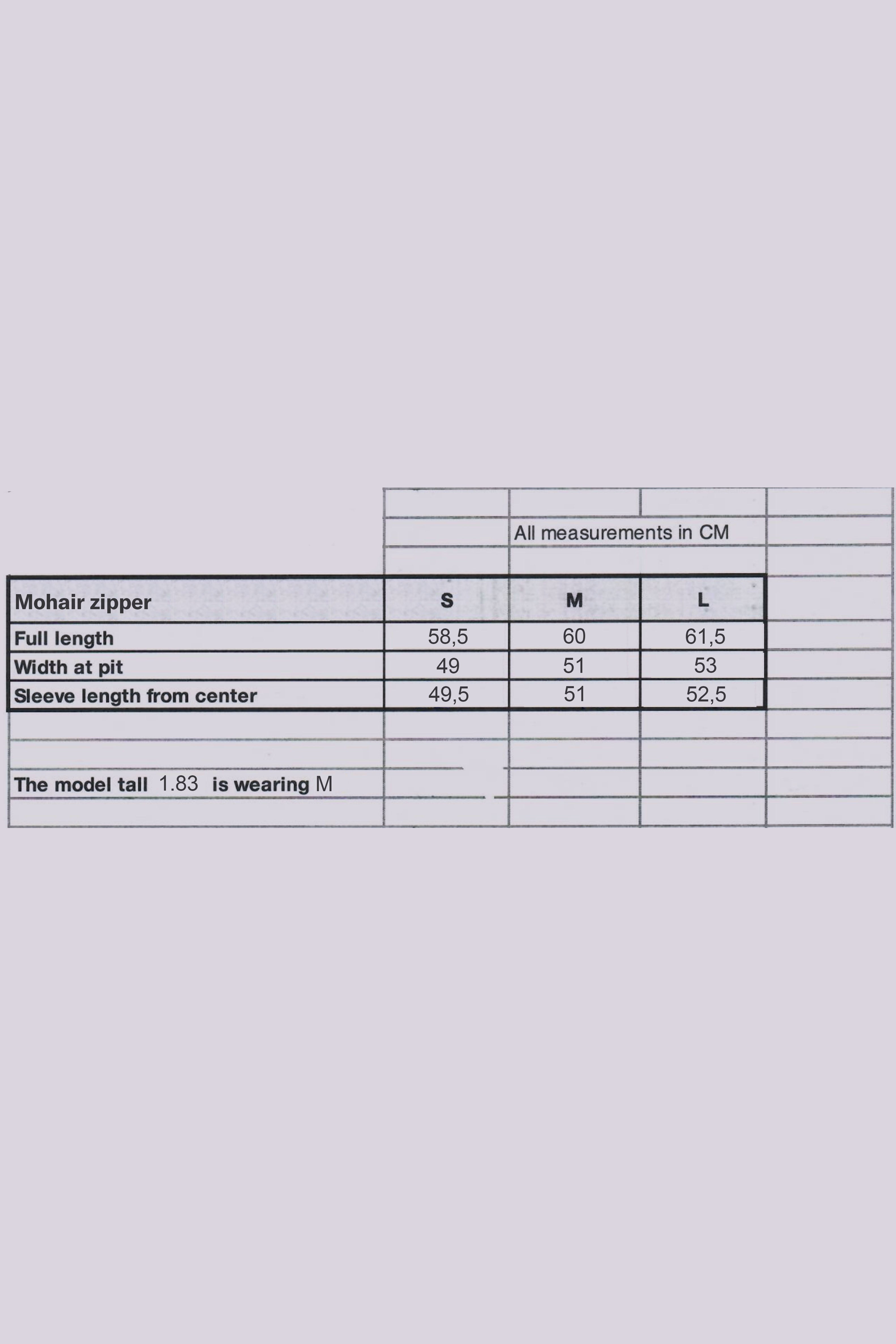 This Mohair zipper jacket fits boxy fit in a soft Mohair. With ribbed funnel neck collar with two way zip, two inserted hand pockets. To help keep the integrity of the garment please store the garment folded.