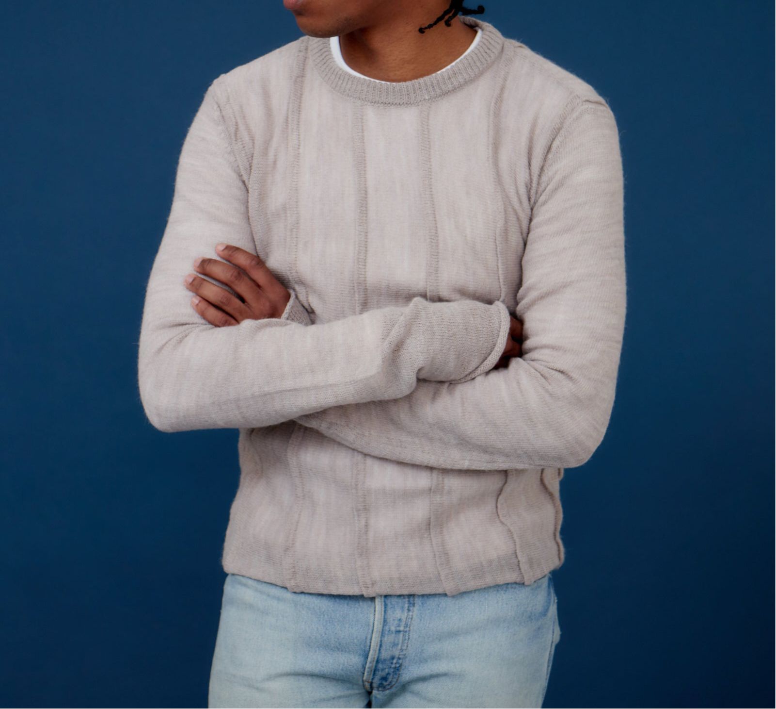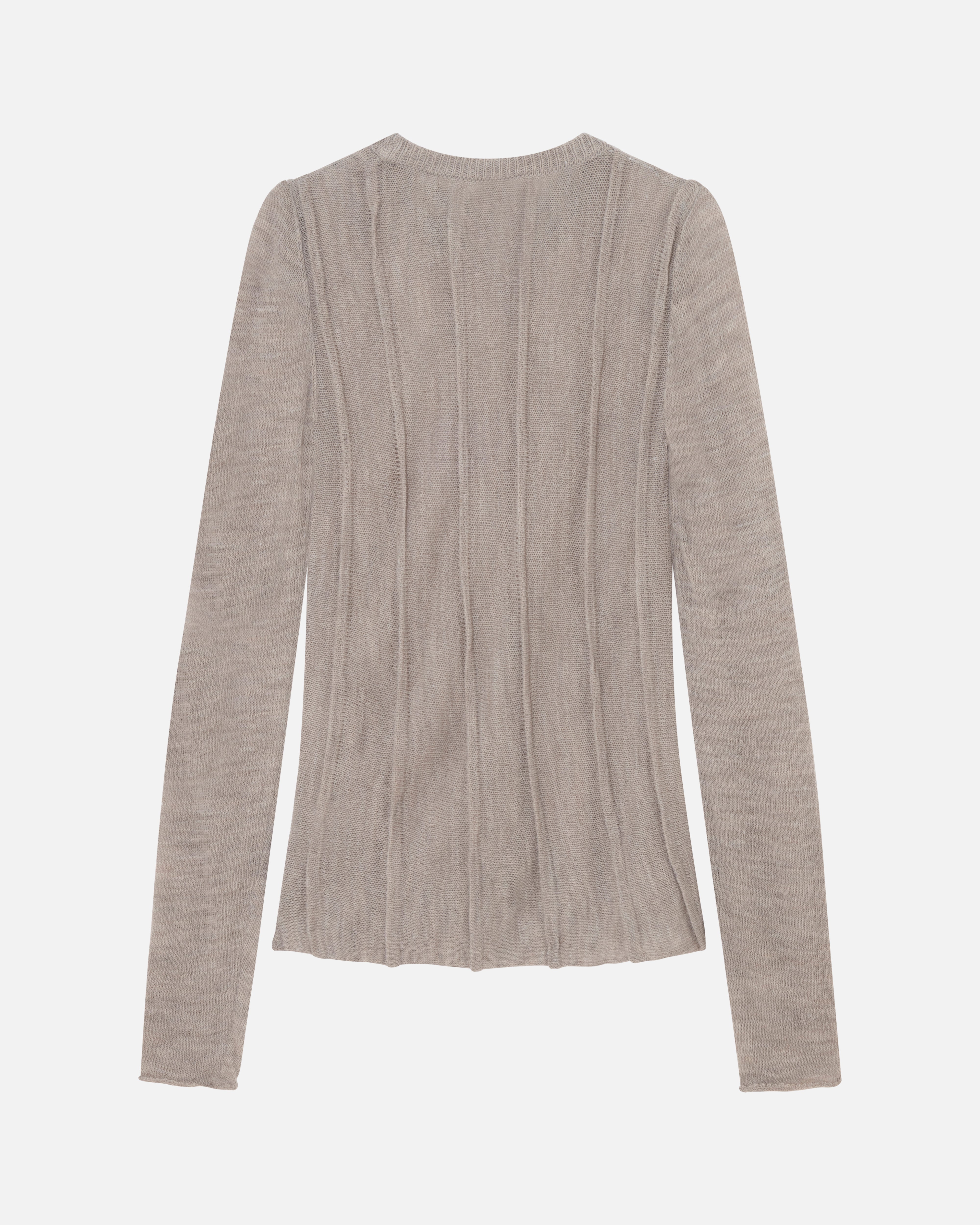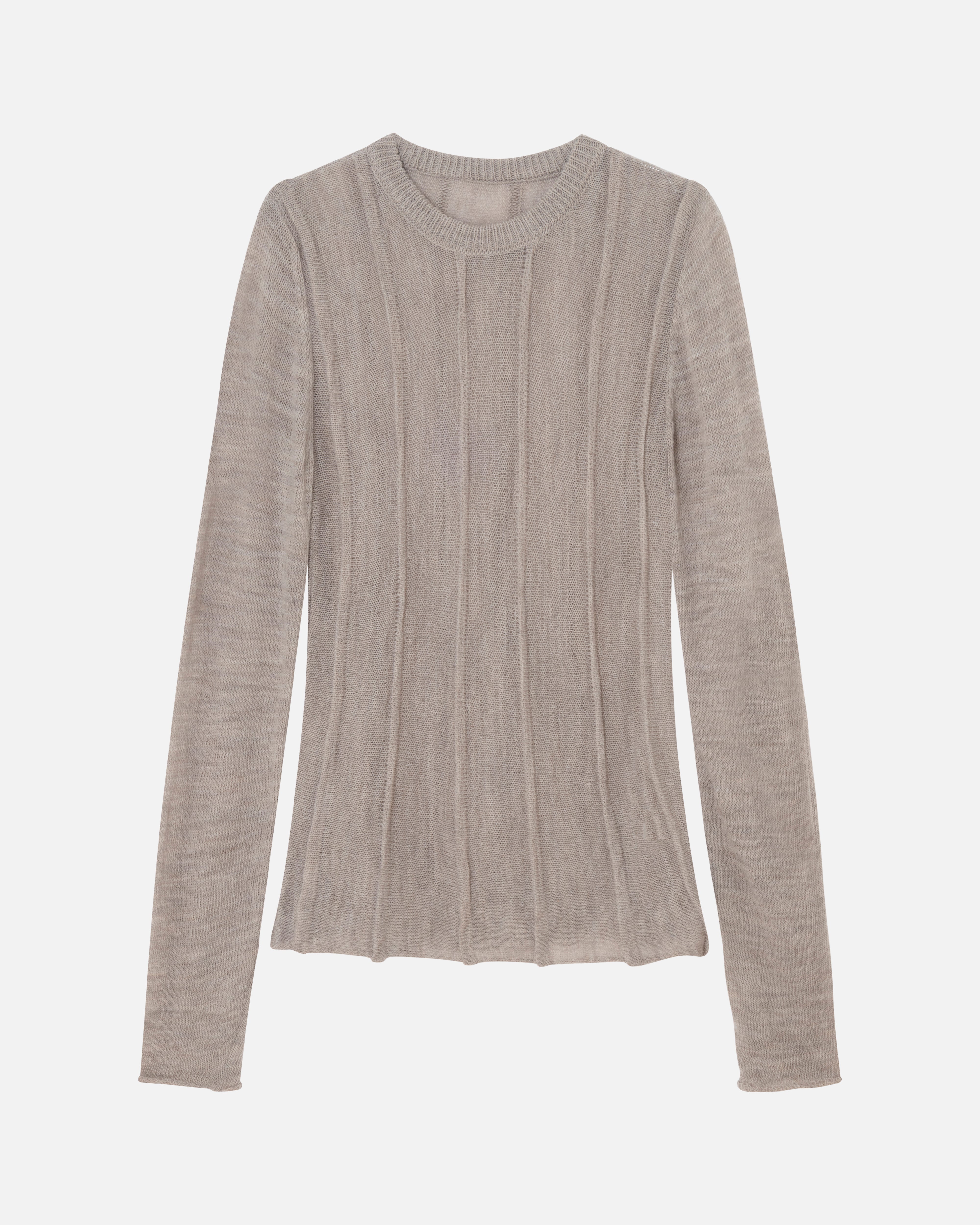 This ribbed sweater features a tailored fit in wool, with vertical structure. It has a ribbed