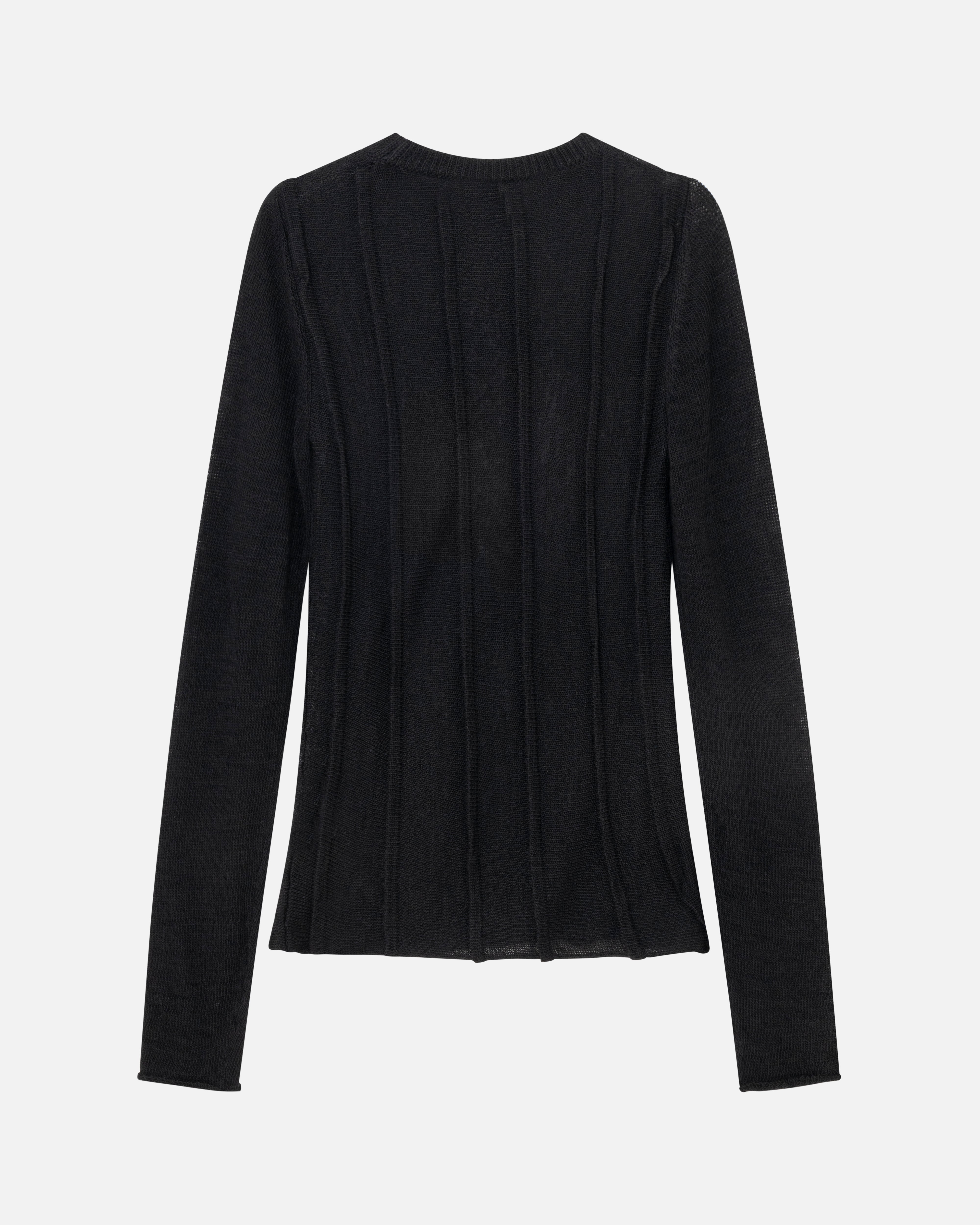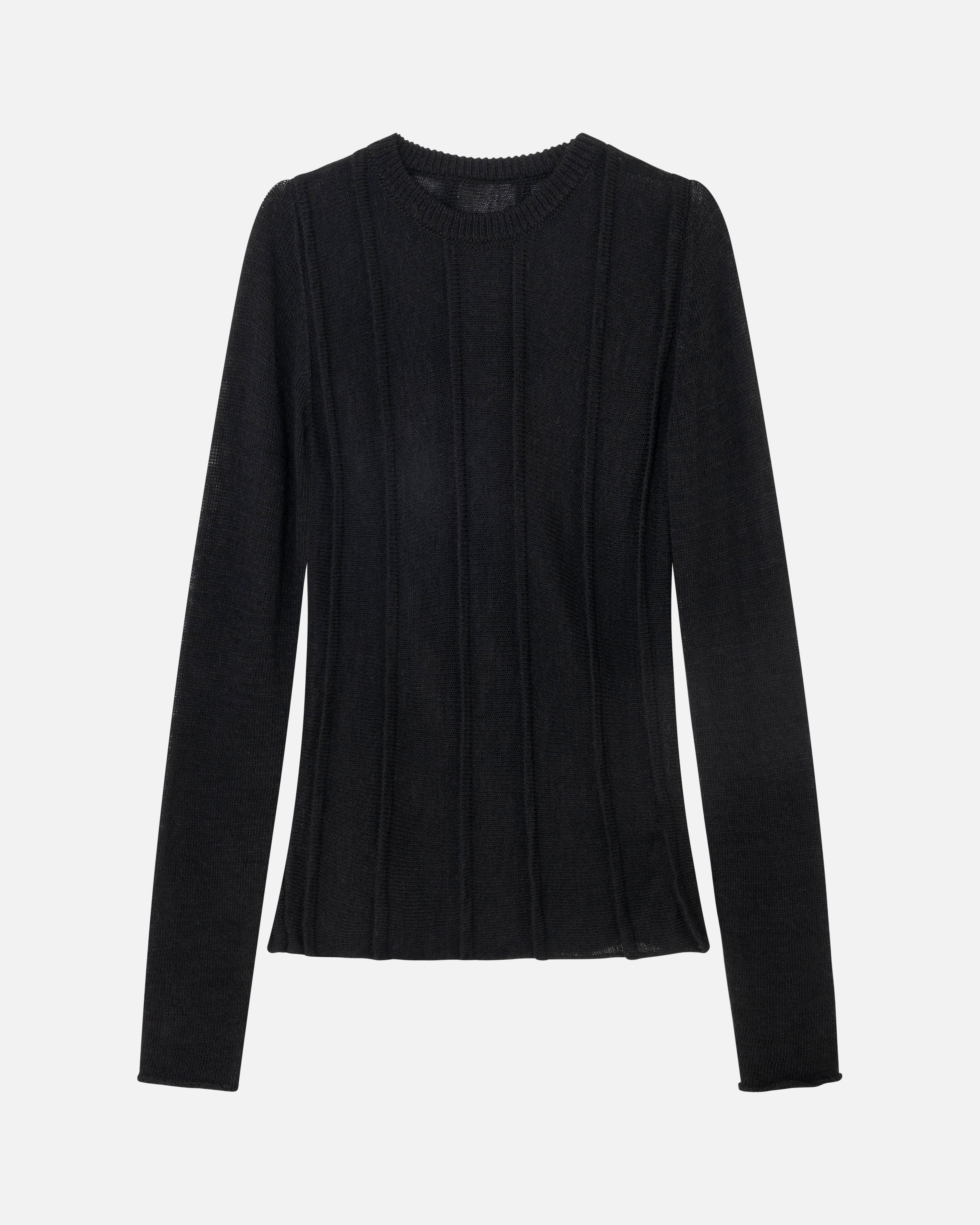 This ribbed sweater features a tailored fit in wool, with vertical structure. It has a ribbed