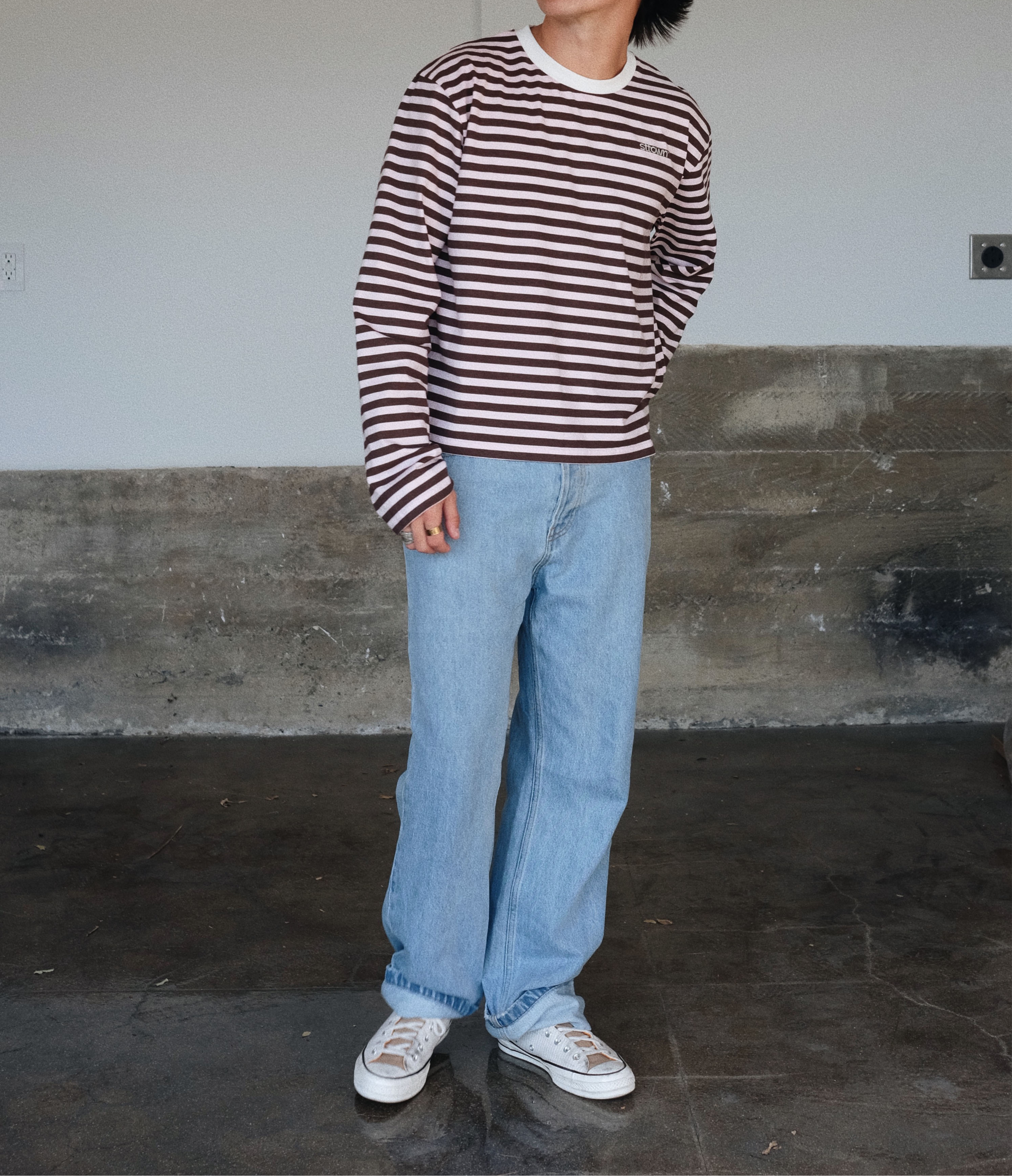 This pink and brown color Stripped long sleeve tee fits relaxed and box fit in 100% cotton. Rib crewneck and sttown embroidery logo on the chest.